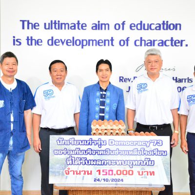 เมื่อวันที่ 24 ตุลาคม 2567 ดร.เกรียง ฐิติจำเริญพร ผู้จัดการ-ผู้อำนวยการ รับมอบเงินจำนวน 150,000 บาท และไข่ไก่จำนวน 130 แผง จากนักเรียนเก่ารุ่น Democracy ’73 ที่ได้ร่วมบริจาคช่วยเหลือโรงเรียนที่ได้รับผลกระทบจากอุทกภัย