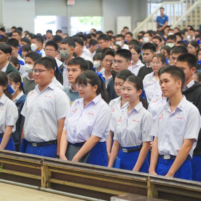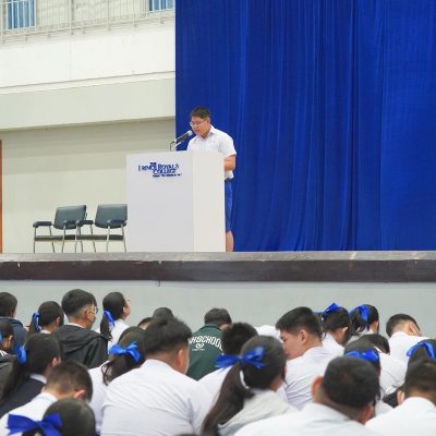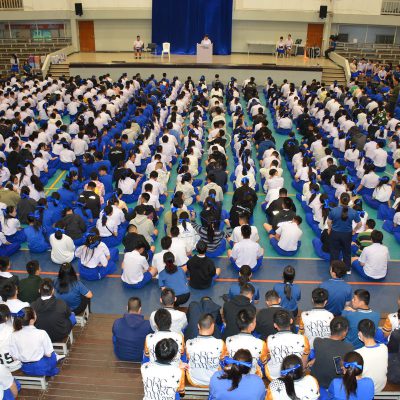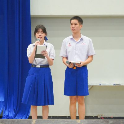 – นายณฐพล ชื่นมนุษย์ นักเรียนชั้น ม.6/11 อ่านสารของนายกรัฐมนตรี