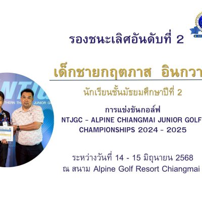 ขอชื่นชมและแสดงความยินดีกับ เด็กชายกฤตภาส อินกวา ชั้นมัธยมศึกษาปีที่ 2/1 ได้รับรางวัล 2st Runner Up : Class BOY-B, Division II การแข่งขันกอล์ฟ รายการ NORTHERN THAILAND JUNIOR GOLF CHAMPiONSHIPS 2024-2025 ระหว่างวันที่ 14-15 มิถุนายน 2568 ณ สนาม Alpine Golf Resort Chiangmai จัดโดย Northern Thailand Junior Golf Club (NTJGC)