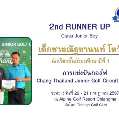 ขอชื่นชม และร่วมแสดงความยินดีกับ เด็กชายณัฐชานนท์ โตวัน นักเรียนชั้นมัธยมศึกษาปีที่ 1/2 ได้รับรางวัล 2nd Runner Up Class Junior Boy การแข่งขันกอล์ฟ รายการ Chang Thailand Junior Golf Circuit 2024 เมื่อวันที่ 21 – 21 กรกฎาคม 2567 ณ Alpine Golf Resort Chiangmai จัดโดย Change Golf Club