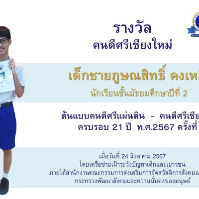 ขอชื่นชมและ ร่วมแสดงความยินดีกับ เด็กชายภูษณสิทธิ์ คงเหลือ นักเรียนชั้นมัธยมศึกษาปีที่ 2/1 ได้รับใบประกาศเกียรติคุณรางวัลคนดีศรีเชียงใหม่ประจำปี 2567 ในพิธีมอบประกาศเกียรติคุณต้นแบบคนดีศรีแผ่นดิน – คนดีศรีเชียงใหม่ ครบรอบ ๒๑ ปี พ.ศ.๒๕๖๗ ครั้งที่ ๒ จากเครือข่ายเฝ้าระวังปัญหาเด็กและเยาวชนภายใต้สำนักงานคณะกรรมการส่งเสริมการจัดสวัสดิการสังคมแห่งชาติกระทรวงพัฒนาสังคมและความมั่นคงของมนุษย์ โดยได้รับความเมตตาจาก พระวิมลมุนี รองเจ้าคณะจังหวัดเชียงใหม่ ประธานในพิธีฯ ณ หอประชุมมหาวิทยาลัยฟาร์อิสเทอร์น อ.เมือง จ.เชียงใหม่ เมื่อวันเสาร์ที่ 24 สิงหาคม 2567