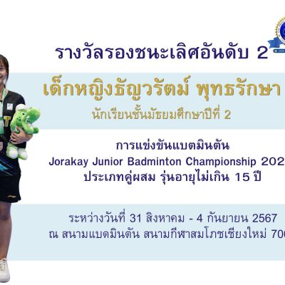 ขอชื่นชมและร่วมแสดงความยินดีกับ เด็กหญิงธัญวรัตม์ พุทธรักษา นักเรียนขั้นมัธยมศึกษาปีที่ 2/8 ได้รับรางวัลรองชนะเลิศอันดับ 2 การแข่งขันแบดมินตัน รายการ Jorakay Junior Badminton Championship 2024 ระหว่างวันที่ 31 สิงหาคม – 4 กันยายน 2567 ณ สนามแบดมินตัน สนามกีฬาสมโภชเชียงใหม่ 700 ปี โรงยิม 1 (ATK Badminton) จัดโดยสมาคมแบดมินตัน แห่งประเทศไทย
