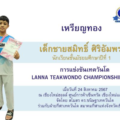 ขอชื่นชมและร่วมแสดงความยินดีกับ เด็กชายสมิทธิ์ ศิริอัมพร นักเรียนชั้นมัธยมศึกษาปีที่ 1/9 ได้รับเหรียญทอง การแข่งขันกีฬาเทควันโด รายการ “Lanna Taekwondo Championship 2024” ประเภท KYORUGI การต่อสู้ สายดำ-แดง รุ่นอายุ 13-14 ปี เมื่อวันเสาร์ ที่ 24 สิงหาคม 2567 ณ เชียงใหม่ฮอลล์ เช็นทรัลเชียงใหม่แอร์พอร์ต จังหวัดเชียงใหม่  จัดโดย สโมสร ดร.ขนิษฐาเทควันโด ร่วมกับฝ่ายกีฬาเทควันโด สมาคมกีฬาแห่งจังหวัดเชียงใหม่