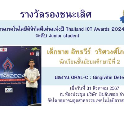 ขอชื่นชมและร่วมแสดงความยินดีกับ เด็กชายอัทธวีร์ วริศวงศ์โกศล นักเรียนชั้นมัธยมศึกษาปีที่ 2/2 ได้รับรางวัลรองชนะเลิศผลงานเทคโนโลยีดิจิทัลดีเด่นแห่งปี Thailand ICT Awards 2024 ระดับ Junior student ผลงาน ORAL-C : Gingivitis Detection เมื่อวันที่ 31 สิงหาคม 2567 ณ ห้องประชุม บริษัท ยิบอินซอย จำกัด จัดโดย สมาคมอุตสาหกรรมเทคโนโลยีสารสนเทศไทย