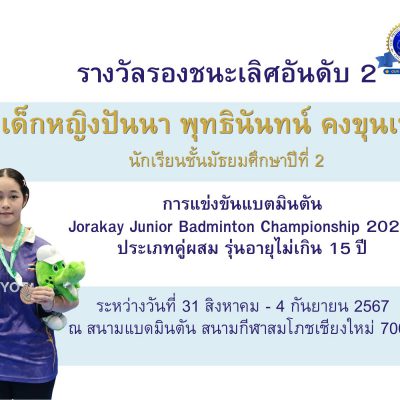 ขอชื่นชมและร่วมแสดงความยินดีกับ เด็กหญิงปันนา พุทธินันทน์ คงขุนเทียน นักเรียนขั้นมัธยมศึกษาปีที่ 2/3 ได้รับรางวัลรองชนะเลิศอันดับ 2 การแข่งขันแบดมินตัน รายการ Jorakay Junior Badminton Championship 2024 ระหว่างวันที่ 31 สิงหาคม – 4 กันยายน 2567 ณ สนามแบดมินตัน สนามกีฬาสมโภชเชียงใหม่ 700 ปี โรงยิม 1 (ATK Badminton) จัดโดยสมาคมแบดมินตัน แห่งประเทศไทย