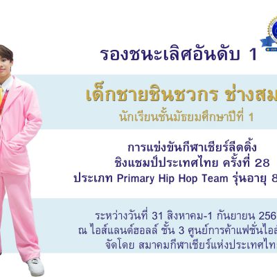 เด็กชายชินชวกร ช่างสม รางวัลรองชนะเลิศอันดับ 1 Primary Hip Hop Team รุ่นอายุ 8-12 ปี การแข่งขันกีฬาเชียร์ลีดดิ้งชิงแชมป์ประเทศไทย ครั้งที่ 28