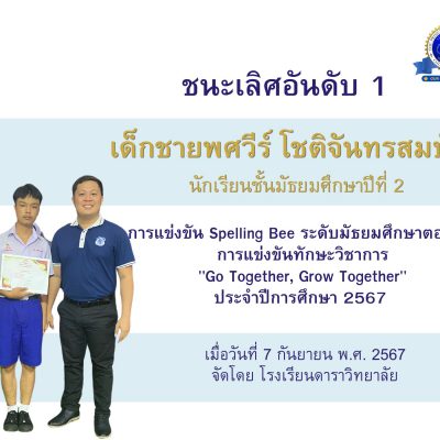 ขอชื่นชมและร่วมแสดงความยินดีกับ เด็กชายพศวีร์ โชติจันทรสมบัติ นักเรียนชั้นมัธยมศึกษาปีที่ 2/5 ได้รับรางวัลชนะเลิศอันดับที่ 1 การแข่งขัน Spelling Bee ระดับมัธยมศึกษาตอนต้น การแข่งขันทักษะวิชาการ “Go Together, Grow Together” ประจำปีการศึกษา 2567 โดย โรงเรียนดาราวิทยาลัย เมื่อวันที่ 7 กันยายน พ.ศ. 2567