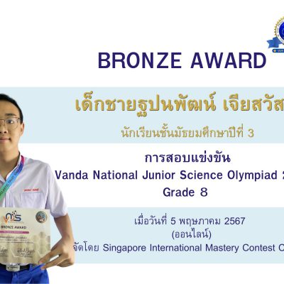 เด็กชายฐปนพัฒน์ เจียสวัสดิ์ รางวัล Bronze award ในการสอบแข่งขัน Vanda National Junior Science Olympiad 2024 Grade 8