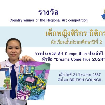 ขอชื่นชมและร่วมแสดงความยินดีกับ เด็กหญิงสิริกร กิติกร นักเรียนชั้นมัธยมศึกษาปีที่ 2/6 ได้รับรางวัล Country winner of the Regional Art competition จาก การประกวด Art Competition ประจำปี 2567 ในห้วข้อ”Dreams Come True” ปี2024 เมื่อวันที่ 21 สิงหาคม 2567 จัดโดย BRITISH COUNCIL