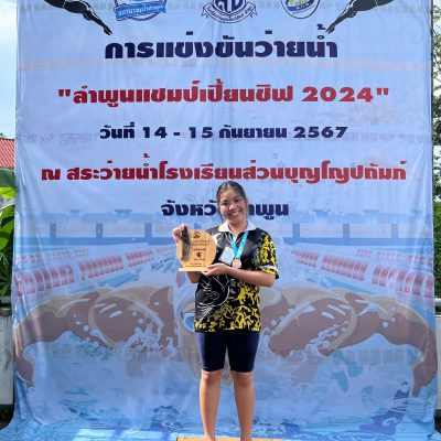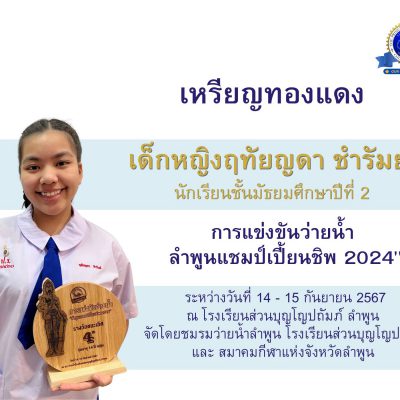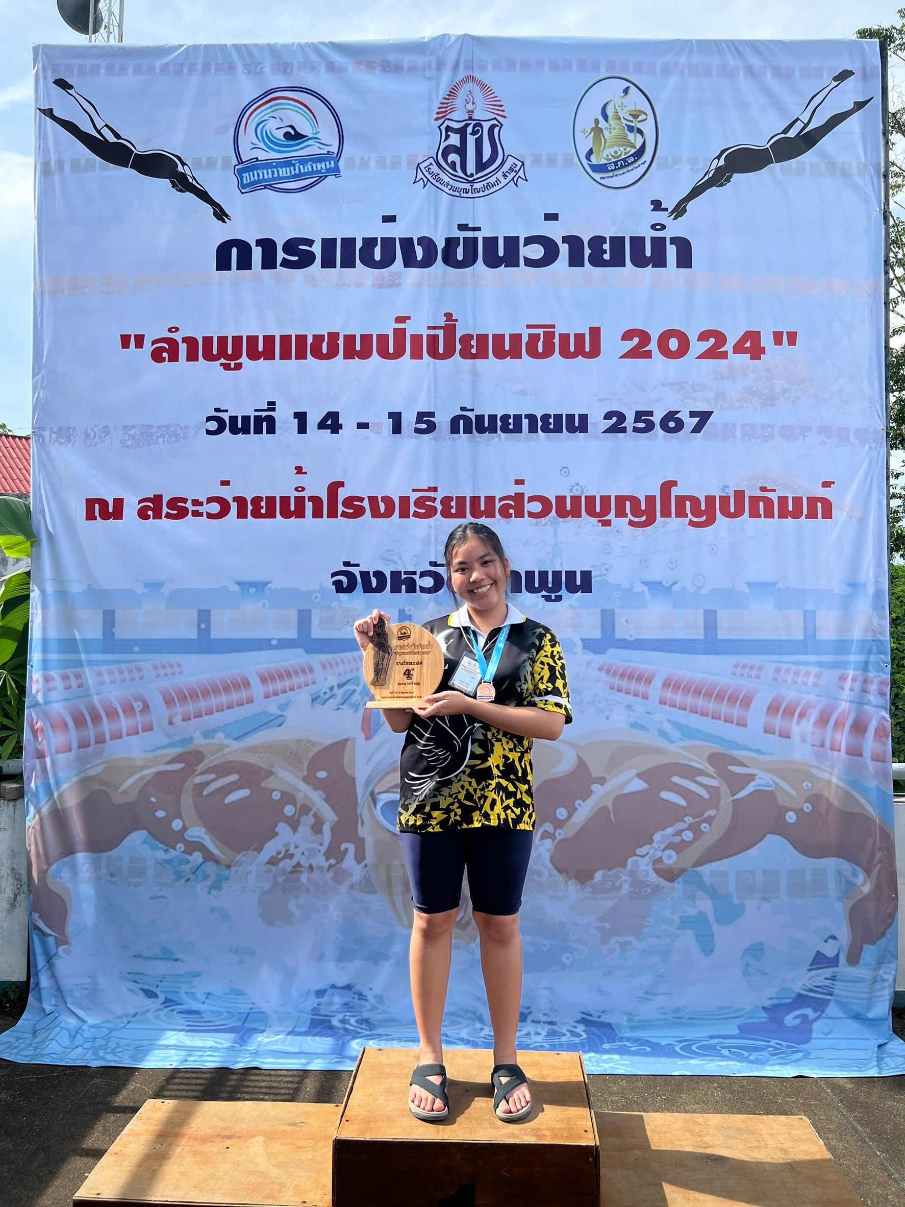 ขอชื่นชมและร่วมแสดงความยินดีกับ เด็กหญิงฤทัยญดา ชำรัมย์ นักเรียนชั้นมัธยมศึกษาปีที่ 2/2 ได้รับถ้วยรางวัลบุคคลชนะเลิศอันดับที่ 4 รุ่นอายุ 14 ปี หญิง และ 1 เหรียญทองแดงจากการแข่งขันว่ายผลัดฟรีไสต์ 50 เมตร เข้าร่วมการแข่งขันว่ายน้ำ รายการ “ลำพูนแชมป์เปี้ยนชิพ 2024” ณ โรงเรียนส่วนบุญโญปถัมภ์ อ.เมือง จังหวัดลำพูน จัดโดย ชมรมว่ายน้ำลำพูน โรงเรียนส่วนบุญโญปถัมภ์ลำพูนและสมาคมกีฬาแห่งจังหวัดลำพูน ระหว่างวันที่ 14-15 กันยายน 2567