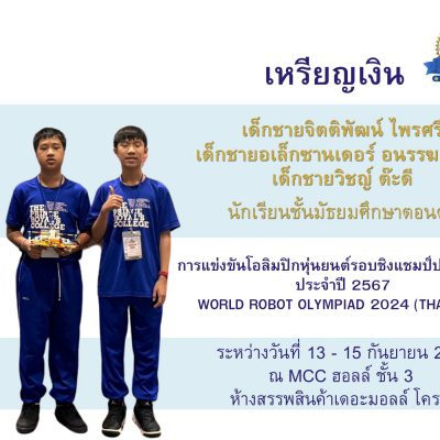 ขอชื่นชมและแสดงความยินดีกับ เด็กชายจิตติพัฒน์ ไพรศรี เด็กชายอเล็กซานเดอร์ อนรรฆ โกโกซ์ และเด็กชายวิชญ์ ต๊ะดี นักเรียนชั้นมัธยมศึกษาตอนต้น ได้รับรางวัล Silver Medal Certificate จากการแข่งขันโอลิมปิกหุ่นยนต์ รอบชิงแชมป์ประเทศไทย ประจำปี 2567 WORLD ROBOT OLYMPIAD 2024 (THAILAND) ระดับชิงแชมป์ประเทศไทย รุ่น JUNIOR
