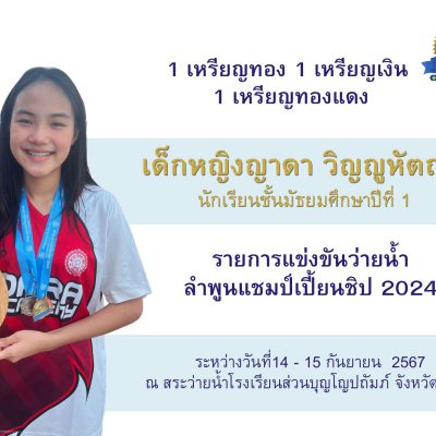 ขอชื่นชมและร่วมแสดงความยินดีกับ เด็กหญิงญาดา วิญญูหัตถกิจ นักเรียนชั้นมัธยมศุึกษาปีที่ 1/3 ได้รับรางวัล ถ้วยคะแนนรวมอันดับที่ 6 รุ่นอายุ 13 ปี หญิง เหรียญทอง กบ 50 เมตรหญิง เหรียญเงิน กรรเชียง 50 เมตรหญิง และเหรียญทองแดง ฟรีสไตล์ 50 เมตรหญิง รายการแข่งขันว่ายน้ำลำพูนแชมป์เปี้ยนชิป 2024 ระหว่างวันที่ 14-15 กันยายน 2567 ณ สระว่ายน้ำโรงเรียนส่วนบุญโญปถัมภ์ จังหวัดลำพูน