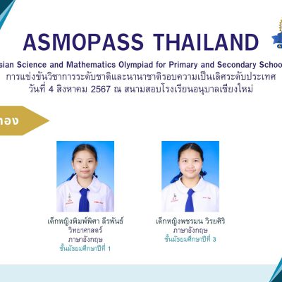 ขอชื่นชมและแสดงความยินดีกับ นักเรียนชั้นมัธยมศึกษาปีที่ 1 – 3 ที่ได้รับรางวัลจากการแข่งขันวิชาการระดับชาติและนานาชาติรอบความเป็นเลิศระดับประเทศ ASMOPSS THAILAND 2024 Asian Science & Mathematics Olympiad for Primary and Secondary Schools วันที่ 4 สิงหาคม 2567 ณ สนามสอบโรงเรียนอนุบาลเชียงใหม่