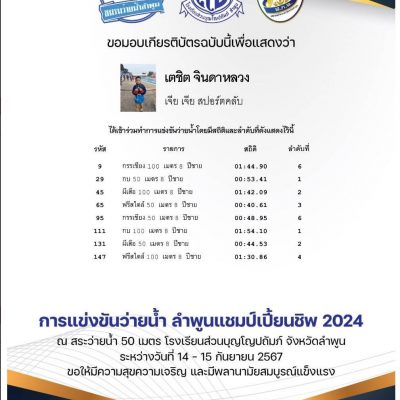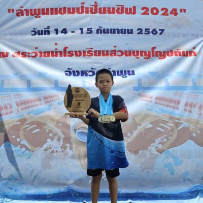 ขอชื่นชมและร่วมแสดงความยินดีกับ เด็กชายเตชิต จินดาหลวง นักเรียนระดับชั้นประถมศึกษาปีที่ 2/2 ได้รับรางวัลถ้วยชนะเลิศอันดับ 2 รุ่นอายุ 8 ปี ชาย และรางวัล 4 เหรียญทอง 2 เหรียญเงิน และ 1 เหรียญทองแดง รายการแข่งขันว่ายน้ำ ลำพูนแชมป์เปี้ยนชิป 2024 ณ สระว่ายน้ำโรงเรียนส่วนบุญโญปถัมภ์ จังหวัดลำพูน เมื่อวันที่ 14-15 กันยายน 2567