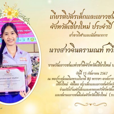 ขอชื่นชมและแสดงความยินดีกับ นางสาวจินตรามณฑ์ ทวีเมธีโชติ ม.4/2 ที่ได้รับเกียรติบัตรเด็กแล้วเยาวชนดีเด่นจังหวัดเชียงใหม่ ประจำปี2567 สาขากีฬาและนันทนาการ เนื่องในวันเยาวชนแห่งชาติสภาเด็กและเยาวชนจังหวัดเชียงใหม่ งานวันเยาวชนแห่งชาติจังหวัดเชียงใหม่ ประจำปี 2567 เมื่อวันที่ 15 กันยายน 2567 ณ หอประชุมเฉลิมพระเกียรติ 80 พรรษา องค์การบริหารส่วนจังหวัดเชียงใหม่ จัดโดย สภาเด็กและเยาวชนจังหวัดเชียงใหม่ ร่วมกับบ้านพักเด็กและครอบครัวจังหวัดเชียงใหม่ และชมรมเยาวชนดีเด่นจังหวัดเชียงใหม่ (ระดับจังหวัด)