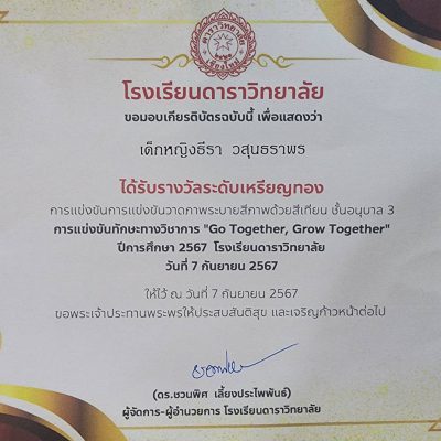 ขอชื่นชมและแสดงความยินดีกับเด็กหญิงธีรา วสุนธราพร อนุบาล 3/9 ได้รับรางวัลเหรียญทอง การแข่งขันวาดภาพระบายสีด้วยสีเทียน ระดับชั้นอนุบาล 3 จากการแข่งขันทักษะทางวิชาการ “Go together, Grow together” ปีการศึกษา 2567 วันที่ 7 กันยายน 2567 ณ โรงเรียนดาราวิทยาลัย จังหวัดเชียงใหม่