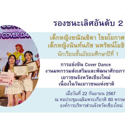 ขอชื่นชมและร่วมแสดงความยินดีกับ เด็กญิงชณัณชิดา ไชยโยกาศ และ เด็กหญิงนันท์นภัส นพรัตน์โยธิน ได้รับรางวัลรองชนะเลิศ อันดับ 2 การแข่งขัน Cover Dance งานมหกรรมส่งเสริมและพัฒนาศักยภาพเยาวชนจังหวัดเชียงใหม่ เนื่องในวันเยาวชนแห่งชาติ อบจ.เชียงใหม่ ประจำปี 2567 ณ หอประชุมเฉลิมพระเกียรติ 80 พรรษา องค์การบริหารส่วนจังหวัดเชียงใหม่ อ.เมืองเชียงใหม่ จ.เชียงใหม่ เมื่อวันที่ 22 กันยายน 2567
