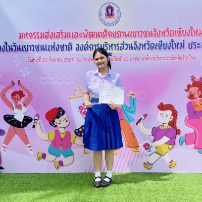 ขอชื่นชมและแสดงความยินดีกับ นางสาวพาขวัญ ปริยะ ม.5/1 ที่ได้รับโล่ประกาศเกียรติคุณ ในฐานะเยาวชนจิตอาสา จังหวัดเชียงใหม่ มหกรรมส่งเสริมและพัฒนาศักยภาพเยาวชนจังหวัดเชียงใหม่ เนื่องในวันเยาวชนแห่งชาติ องค์การบริหารส่วนจังหวัดเชียงใหม่ประจำปี 2567 จัดโดย องค์การบริหารส่วนจังหวัดเชียงใหม่ (ระดับจังหวัด)
