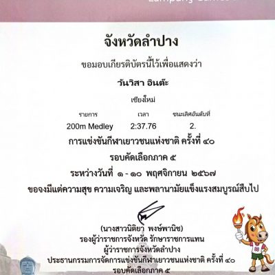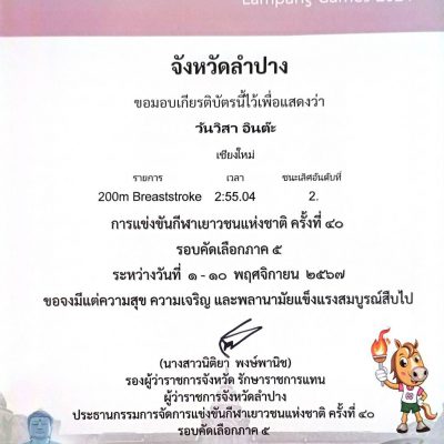 – ว่ายน้ำกบ 200 เมตร ชนะเลิศอันดับที่ 2