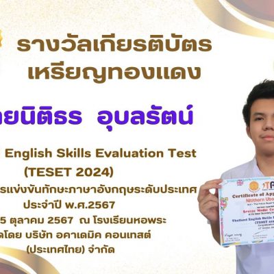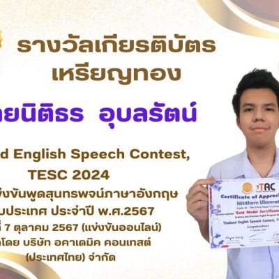 - รางวัลเกียรติบัตรเหรียญทอง Thailand English Speech Contest, TESC 2024 โครงการแข่งขันการพูดสุนทรพจน์ภาษาอังกฤษระดับประเทศ ประจำปี พ.ศ.2567 เมื่อวันที่ 7 ตุลาคม 2567 (แข่งขันออนไลน์) จัดโดย บริษัท อคาเดมิค คอนเทสต์ (ประเทศไทย) จำกัด