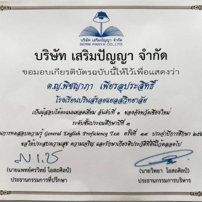 ได้รับรางวัลเหรียญทอง วิชาภาษาอังกฤษ ได้รับคะแนนสูงสุด อันดับ 1 ของจังหวัด อันดับ 8 ของภาค และอันดับ 44 ของประเทศ