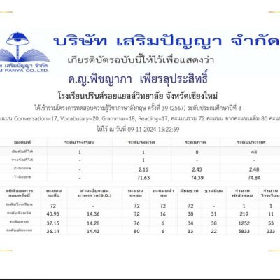 จากการแข่งขัน โครงการทดสอบความรู้วิชาภาษาอังกฤษ ครั้งที่39 (2567) ระดับประถมศึกษาปีที่ 3