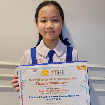 เด็กหญิงธารา วสุนธราพร ชั้นประถมศึกษาปีที่ 3/1 ที่ได้รับรางวัลเกียรติบัตรเหรียญทอง วิชาภาษาอังกฤษ จากการแข่งขันโครงการประเมินทักษะภาษาอังกฤษระดับประเทศ ครั้งที่ 5