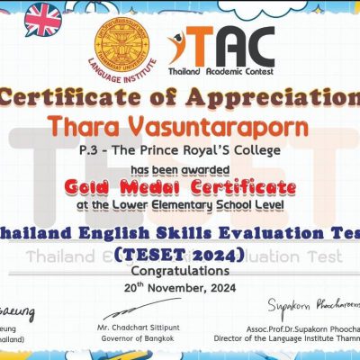 ขอชื่นชมและร่วมแสดงความยินดีกับเด็กหญิงธารา วสุนธราพร ชั้นประถมศึกษาปีที่ 3/1 ที่ได้รับรางวัลเกียรติบัตรเหรียญทอง วิชาภาษาอังกฤษ จากการแข่งขันโครงการประเมินทักษะภาษาอังกฤษระดับประเทศ ครั้งที่ 5 5th TESET ( Thailand English Skill Evaluation Test ) จัดโดย บริษัท อคาเดมิค คอนเทสต์ ประเทศไทยจำกัด ณ โรงเรียนหอพระ เมื่อวันที่ 18 สิงหาคม 2567