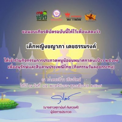 ขอชื่นชมและร่วมแสดงความยินดีกับ เด็กหญิงชญาภา เดชธรรมรงค์ ชั้นประถมศึกษาปีที่ 2/6 ได้รับเลือกเป็นตัวแทนเข้าร่วมนั่งขบวนกระทงใหญ่ งานเประเพณียี่เป็งเชียงใหม่ ประจำปี 2567 ของขบวนเยาวชนผู้สร้างชื่อเสียงให้แก่จังหวัดเชียงใหม่ ภาคเหนือ ในการประกวดกระทงใหญ่ชิงถ้วยพระราชทานฯ จัดโดย สำนักงานเทศบาลนครเชียงใหม่ ณ ข่วงประตูท่าแพ – สำนักงานเทศบาลนครเชียงใหม่ เมื่อวันที่ 16 พฤศจิกายน 2567
