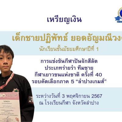 ขอชื่นชมและร่วมแสดงความยินดีกับ เด็กชายปฏิพัทธ์ ยอดอัญมณีวงศ์ นักเรียนชั้นมัธยมศึกษาปีที่ 1 ได้รับเหรียญเงิน การแข่งขันกีฬาปันจักสีลัต ประเภทร่ายรำทีมชาย กีฬาเยาวชนแห่งชาติ รอบคัดเลือกภาค 5 เมื่อวันที่ 3 พฤศจิกายน 2567 ที่ จังหวัดลำปาง