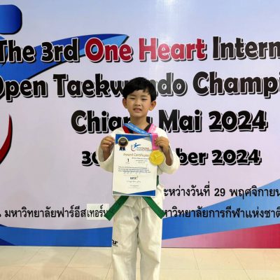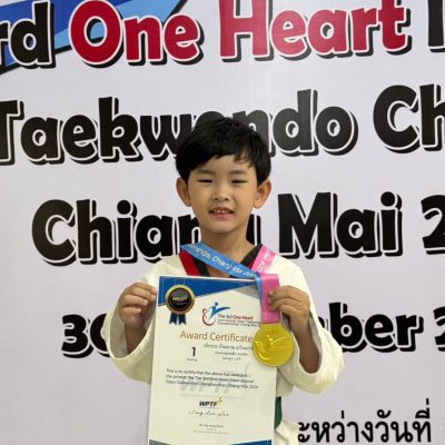 ขอชื่นชมและแสดงความยินดีกับเด็กชายกันตภณ แก้วแปงจันทร์ อนุบาล 3/2 ได้รับรางวัล เหรียญทอง พุมเซ่เดี่ยว สายเขียว รุ่นอายุ 5 – 6 ปี จากการแข่งขัน The 3rd One Heart International Open Taekwondo Championships Chiang Mai 2024 เมื่อวันที่ 30 พฤศจิกายน 2567 ณ มหาวิทยาลัยฟาร์อีสเทอร์น จังหวัดเชียงใหม่