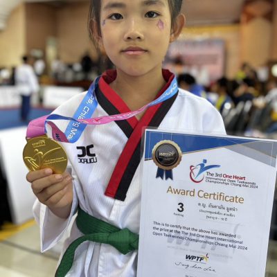ขอแสดงความชื่นชมและร่วมแสดงความยินดีกับ เด็กหญิงอันดามัน มูลนำ นักเรียนชั้นประถมศึกษาปีที่ 3/4 ที่ได้รับรางวัล Bronze MEDAL ประเภท พุมเซ่ รุ่น Junior Female 9-10 years old รายการ The 3rd One Heart International Open Taekwondo Championship Chiang Mai 2024 ชิงแชมป์นานาชาติ ปี 2567 เมื่อวันที่ 30 พฤศจิกายน 2567 ณ มหาวิทยาลัยฟาร์อีสเทิร์น เชียงใหม่ จัดโดย World Para Taekwondo Federation