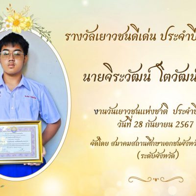 ขอชื่นชมและแสดงความยินดีกับ นายจิระวัฒน์ โตวัฒน์นิมิต ม.5/7 ที่ได้รับการคัดเลือกให้เป็นเยาวชนดีเด่น ในโอกาสวันเยาวชนแห่งชาติ ประจำปี 2567 เมื่อวันที่ 28 กันยายน 2567 จัดโดยสมาคมสถานศึกษาเอกชนจังหวัดเชียงใหม่ (ระดับจังหวัด)