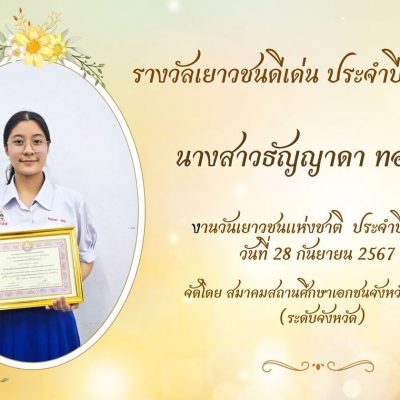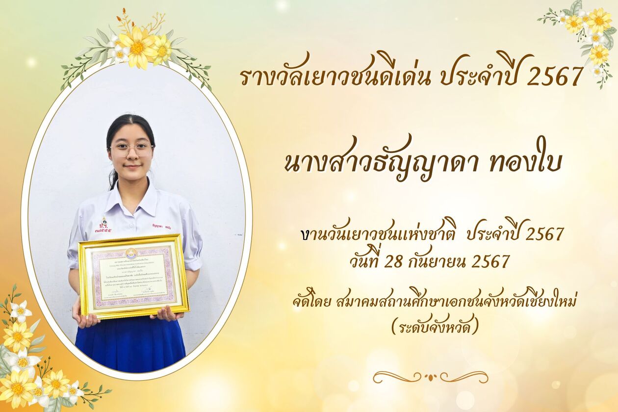 ขอชื่นชมและแสดงความยินดีกับ นางสาวธัญญาดา ทองใบ ม.6/7 ที่ได้รับการคัดเลือกให้เป็นเยาวชนดีเด่น ในโอกาสวันเยาวชนแห่งชาติ ประจำปี 2567 เมื่อวันที่ 28 กันยายน 2567 จัดโดยสมาคมสถานศึกษาเอกชนจังหวัดเชียงใหม่ (ระดับจังหวัด)