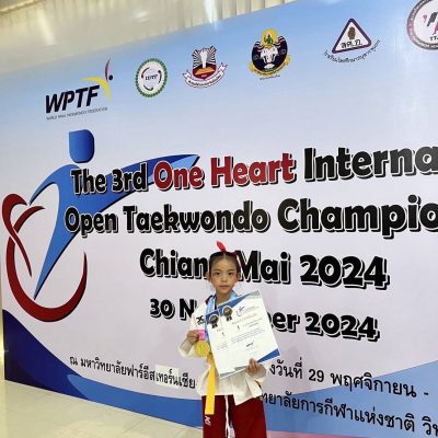 รางวัลที่ได้รับ 2 เหรียญทอง พุมเซ่เดี่ยว สายเหลือง รุ่นอายุ 7-8 ปี หญิง และ speed kick รุ่นอายุ 7-8 ปี หญิง  รายการ The 3rd one heart international open teakwondo championships chiangmai 2024 World Para Taekwondo Federation ร่วมกับ สมาคมเทควันโดจังหวัดเชียงใหม่ และมหาวิทยาลัยการกีฬาแห่งชาติ วิทยาเขตเชียงใหม่ ณ มหาวิทยาลัยฟาร์อีสเทิร์น เมื่อวันที่ 30 พฤศจิกายน 2567