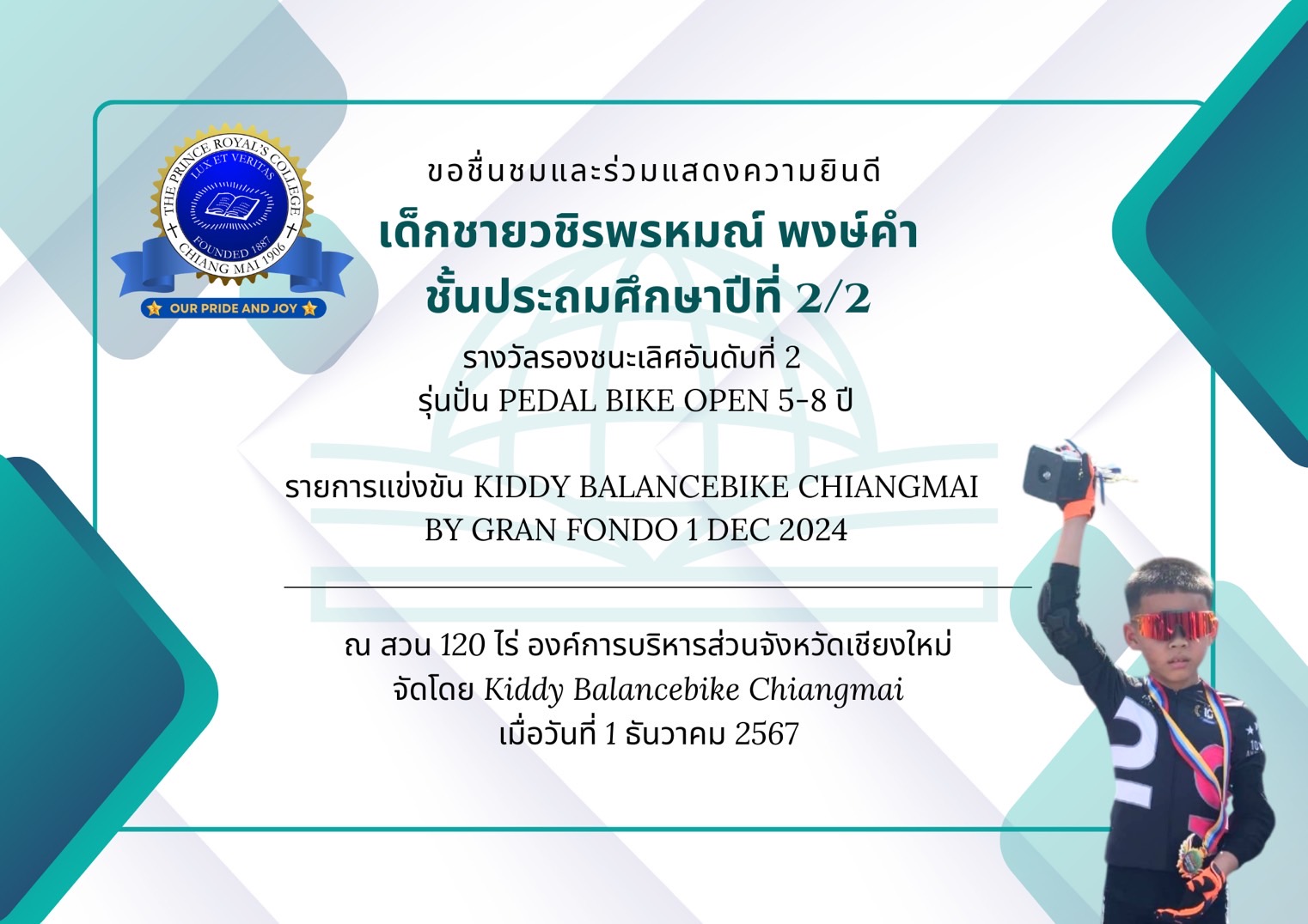 เด็กชายวชิรพรหมณ์ พงษ์คำแดง ชั้นประถมศึกษาปีที่ 2/2 ได้รับรางวัลรองชนะเลิศอันดับที่ 2 รุ่นปั่น Pedal Bike Open 5-8 ปี รายการแข่งขัน Kiddy Balancebike Chiangmai by Gran Fondo 1 Dec 2024