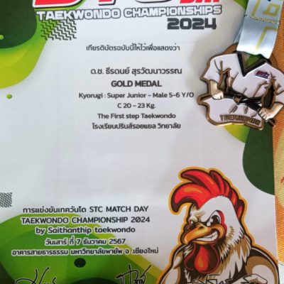 ขอชื่นชมและแสดงความยินดีกับเด็กชายธีรดนย์ สุรวัฒนาวรรณ อนุบาล 3/10 ได้รับรางวัล GOLD MEDAL รายการต่อสู้ KYORUGI : SUPERJUNIOR – MALE รุ่นอายุ 5 – 6 ปี น้ำหนัก 20 – 23 Kg. จากการแข่งขัน STC MATCH DAY TAEKWONDO CHAMPIONSHIP 2024 by Saithanthip taekwondo เมื่อวันที่ 7 ธันวาคม 2567 ณ อาคารสายธารธรรม มหาวิทยาลัยพายัพ จังหวัดเชียงใหม่