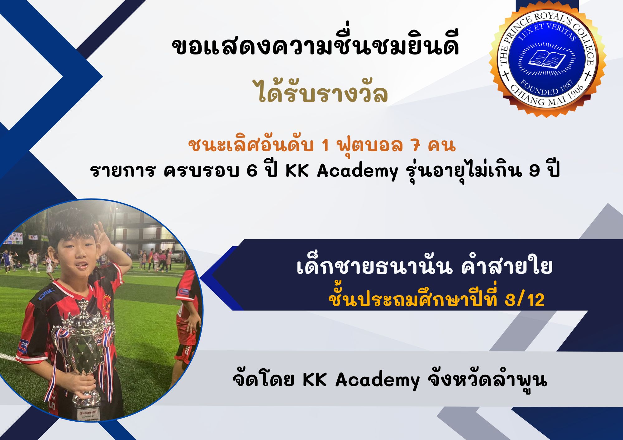 ขอชื่นชมและร่วมแสดงความยินดีกับเด็กชายธนานัน คำสายใย ชั้นประถมศึกษาปีที่ 3/12 ที่ได้รับรางวัลชนะเลิศอันดับ 1 การแข่งขันฟุตบอล 7 คน รายการ ครบรอบ 6 ปี KK Academy รุ่นอายุไม่เกิน 9 ปี จัดโดย KK Academy จังหวัดลำพูน เมื่อวันที่ 16 พฤศจิกายน 2567