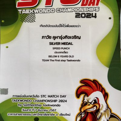 ขอชื่นชมและแสดงความยินดีกับเด็กชายภาวัช คูหารุ่งกิจเจริญ อนุบาล 3/10 ได้รับรางวัล SILVER MEDAL ประเภทชกเร็ว (SPEED PUNCH) รุ่นอายุ 6 ปี จากการแข่งขัน STC MATCH DAY TAEKWONDO CHAMPIONSHIP 2024 by Saithanthip taekwondo เมื่อวันที่ 7 ธันวาคม 2567 ณ อาคารสายธารธรรม มหาวิทยาลัยพายัพ จังหวัดเชียงใหม่