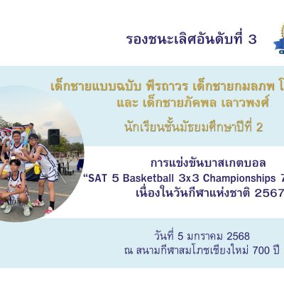 ขอชื่นชมและร่วมแสดงความยินดีกับ เด็กชายแบบฉบับ พีรถาวร เด็กชายกมลภพ โรจนวิภาต และเด็กชายภัคพล เลาวพงศ์ นักเรียนชั้นมัธยมศึกษาปีที่ 1 ได้รับรางวัลรองชนะเลิศอันดับที่สาม การแข่งขันบาสเก็ตบอล รุ่นอายุ 15 ปี รายการ “SAT 5 Basketball 3×3 Championships 700 years” เนื่องในวันกีฬาแห่งชาติ 2567 เมื่อวันอาทิตย์ ที่ 5 มกราคม 2568ณ สนามกีฬาสมโภชเชียงใหม่ 700 ปี