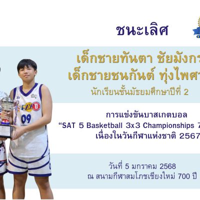 ขอชื่นชมและร่วมแสดงความยินดีกับ เด็กชายทันตา ชัยมังกร และ เด็กชายชนกันต์ ทุ่งไพศาล นักเรียนชั้นมัธยมศึกษาปีที่ 2 ได้รับรางวัลชนะเลิศ รุ่นอายุไม่เกิน 15 ปี ชาย การแข่งขันบาสเกตบอล “SAT 5 Basketball 3×3 Championships 700 years” เนื่องในวันกีฬาแห่งชาติ 2567 เมื่อวันอาทิตย์ที่ 5 มกราคม 2568 ณ สนามกีฬาสมโภชเชียงใหม่ 700 ปี จังหวัดเชียงใหม่ จัดโดย สำนักงานการกีฬาแห่งประเทศไทย ภาค 5 จังหวัดเชียงใหม่