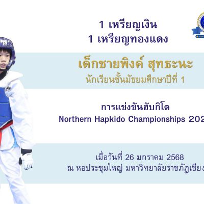 ขอชื่นชมและร่วมแสดงความยินดีกับ เด็กชายพิงค์ สุทธะนะ นักเรียนชั้นมัธยมศึกษาปีที่ 1 ได้รับ 1 เหรียญเงิน ประเภท Speed kick รุ่นอายุ 13 – 14 ปี (ชาย) และ 1 เหรียญทองแดง ประเภทต่อสู้ kyorugi อายุ 13 – 14 ปี ชาย น้ำหนัก 39 – 43 kg. การแข่งขันฮับกิโด รายการ Northern Hapkido Championships 2025 ระหว่างวันที่25 – 26 มกราคม 2568 ณ หอประชุมใหญ่ มหาวิทยาลัยราชภัฏเชียงราย จัดโดย จังหวัดเชียงราย ร่วมกับ สำนักงานการท่องเที่ยวและกีฬาจังหวัดเชียงราย และมหาวิทยาลัยราชภัฎเชียงราย