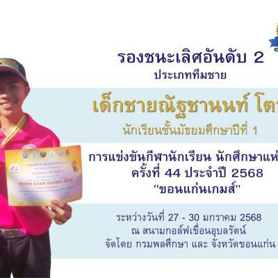 ขอชื่นชมและแสดงความยินดีกับ เด็กชายณัฐชานนท์ โตวัน นักเรียนชั้นมัธยมศึกษาปีที่ 1 ได้รับรองชนะเลิศอันดับ 2 กีฬากอล์ฟ ประเภททีมชาย ในการแข่งขันกีฬานักเรียน นักศึกษาแห่งชาติ ครั้งที่ 44 ประจำปี 2568 “ขอนแก่นเกมส์” ณ สนามกอล์ฟเขื่อนอุบลรัตน์ จังหวัดขอนแก่น ระหว่างวันที่ 27 – 30 มกราคม 2568จัดโดย กรมพลศึกษา และ จังหวัดขอนแก่น