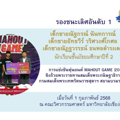 ขอชื่นชมและร่วมแสดงความยินดีกับ เด็กชายณัฐกรณ์ นันทการณ์ เด็กชายอัทธวีร์ วริศวงศ์โกศล และ เด็กชายณัฏฐวรรธน์ ธนพลดำรงเดช นักเรียนชั้นมัธยมศึกษาปีที่ 2 ได้รับรางวัลรองชนะเลิศ อันดับที่ 1 ในการแข่งขันหุ่นยนต์ MAHOUT GAME 2025 ชิงถ้วยพระราชทานสมเด็จพระกนิษฐาธิราชเจ้า กรมสมเด็จพระเทพรัตนราชสุดาฯ สยามบรมราชกุมารี ระดับมัธยมศึกษาตอนต้น จัดโดย คณะวิศวกรรมศาสตร์ มหาวิทยาลัยเชียงใหม่ เมื่อวันที่ 1 กุมภาพันธ์ 2025 ณ คณะวิศวกรรมศาสตร์ มหาวิทยาลัยเชียงใหม่