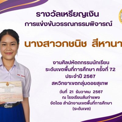 ขอชื่นชมและแสดงความยินดีกับ นางสาวกชณิช สีหานาถ ม.6/6 ที่ได้รับรางวัลเหรียญเงิน จากการเข้าร่วมกิจกรรมงานศิลปหัตถกรรมนักเรียน ระดับเขตพื้นที่การศึกษา ครั้งที่ 72 ประจำปี 2567 สหวิทยาเขตกลุ่มดอยสุเทพ เมื่อวันที่ 21 ธันวาคม 2567 จัดโดย สำนักงานเขตพื้นที่การศึกษามัธยมศึกษาเชียงใหม่ (ระดับเขต)
