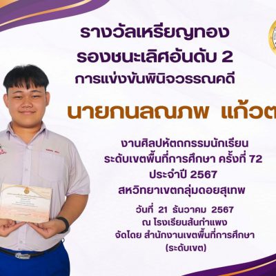 ขอชื่นชมและแสดงความยินดีกับ นายกนลณภพ แก้วตา ม.6/5 ที่ได้รับรางวัลเหรียญทอง รองชนะเลิศอันดับที่ 2 จากการเข้าร่วมกิจกรรมงานศิลปหัตถกรรมนักเรียน ระดับเขตพื้นที่การศึกษา ครั้งที่ 72 ประจำปี 2567 สหวิทยาเขตกลุ่มดอยสุเทพ เมื่อวันที่ 21 ธันวาคม 2567 จัดโดย สำนักงานเขตพื้นที่การศึกษามัธยมศึกษาเชียงใหม่ (ระดับเขต)