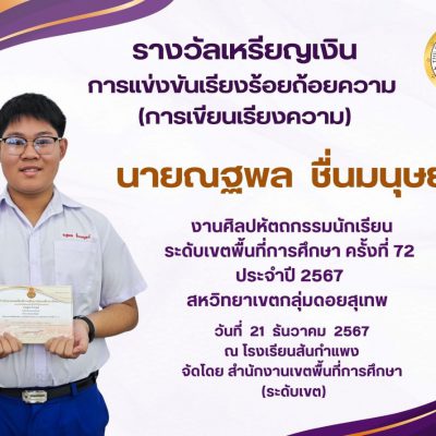 ขอชื่นชมและแสดงความยินดีกับ นายณฐพล ชื่นมนุษย์ ม.5/11 ที่ได้รับรางวัลเหรียญเงิน จากการเข้าร่วมกิจกรรมงานศิลปหัตถกรรมนักเรียน ระดับเขตพื้นที่การศึกษา ครั้งที่ 72 ประจำปี 2567 สหวิทยาเขตกลุ่มดอยสุเทพ เมื่อวันที่ 21 ธันวาคม 2567 จัดโดย สำนักงานเขตพื้นที่การศึกษามัธยมศึกษาเชียงใหม่ (ระดับเขต)