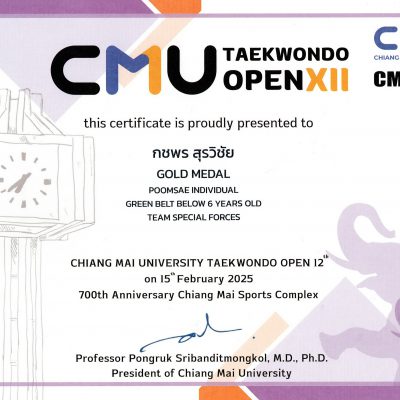 ขอชื่นชมและแสดงความยินดีกับเด็กหญิงกชพร สุรวิชัย อนุบาล 3/8 ได้รับรางวัล 1 เหรียญทอง รายการพุมเซ่ สายเขียว BELOW 6 YEARS OLD จากการแข่งขันเทควันโด CMU TAEKWONDO OPEN ครั้งที่ 12 ประจำปี 2568 จัดโดย ชมรมเทควันโดมหาวิทยาลัยเชียงใหม่ ร่วมกับสถาบันสมาร์ทเทควันโดและศูนย์กีฬาเทควันโดสนามกีฬา 700 ปี จังหวัดเชียงใหม่ เมื่อวันที่ 15 กุมภาพันธ์ 2568 ณ โรงยิมพละ 2 สนามกีฬาสมโภช 700 ปี จังหวัดเชียงใหม่