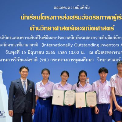 โรงเรียนปรินส์รอยแยลส์วิทยาลัย เข้าร่วมพิธีมอบประกาศนียบัตรแสดงความยินดีแก่นักประดิษฐ์และนักวิจัยไทยที่ได้รับรางวัลจากเวทีนานาชาติ Internationally Outstanding Inventors Awards Ceremony วันพุธที่ 15 มิถุนายน 2565 เวลา 13.00 น. ณ ห้องมัฆวานรังสรรค์ ชั้น 3 สโมสรทหารบก วิภาวดี