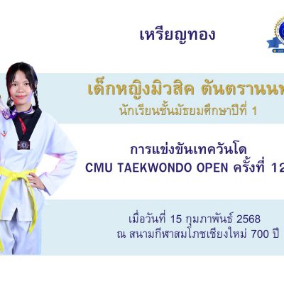 ขอชื่นชมและร่วมแสดงความยินดีกับ เด็กหญิงมิวสิค ตันตรานนท์ นักเรียนชั้นมัธยมศึกษาปีที่ 1 ได้รับ รางวัลชนะเลิศเหรียญทองประเภทต่อสู้ Kyorugi รุ่นอายุ 13-14 ปี หญิง น้ำหนัก 43-47 กก. การแข่งขันเทควันโด รายการ CMU TAEKWONDO OPEN ครั้งที่ 12 เมื่อวันที่ 15 กุมภาพันธ์ 2568 ณ สนามกีฬาสมโภชเชียงใหม่ 700 ปี